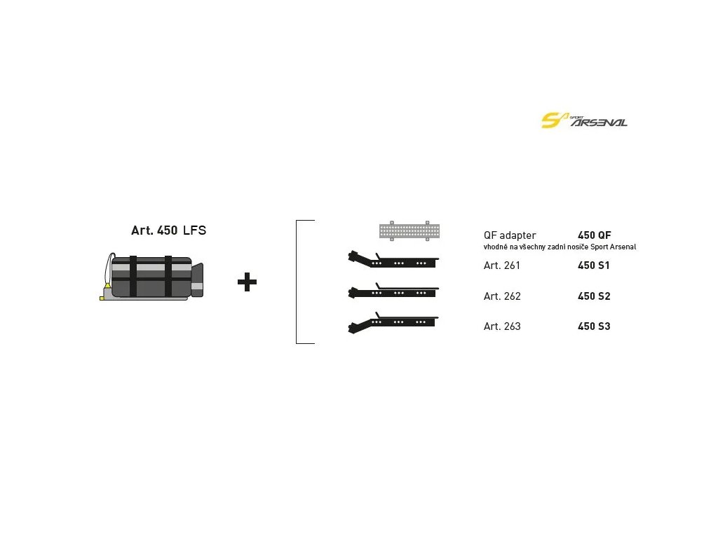 Na klasické zadní nosiče Sport Arsenal nebo přední nosič art.203 Sport Arsenal lze tuto brašnu použít po přidání adaptéru Art.185 QF . Originální QuickFix systém přináší jednoduché, rychlé a spolehlivé uchycení brašny k nosiči.