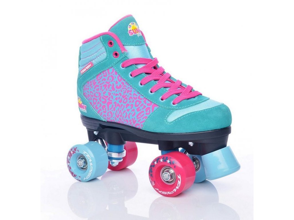 Sluneční kolekce byla vytvořena pro každého, kdo se chce v létě dobře bavit. Atraktivní líbivý design a komfortní bota je ideální pro děti a teenagery, kteří se chtějí dobře pobavit, nebo kteří chtějí začít s tímto sportem. Bota má nižší stavbu pro volnější ovládání. Celá stavba a konstrukce je měkčí pro skutečně pohodlné a zábavné bruslení a ovládání brusle - tomu také odpovídá měkčí nastavení podvozku s měkkými vysoce kvalitními silenbloky z materiálu PUC o tvrdosti 80A. Bota je vyrobena v kombinaci pravé kůže, PVC a tkané textilie, ozdobena je embosovaným i klasickým potiskem a plastickým štítkem s logem TEMPISH. V oblasti kotníků a Achillovy šlachy je měkká bandáž pro větší komfort při bruslení. Brusle je osazena kvalitními komponenty: podvozky jsou z AL slitiny a kolečky ve dvou barvách z materiálu PUC o tvrdosti 85A. Atraktivitu modelu TEMPISH SUNNY LEOPARD zvyšuje moderní tyrkysovo-růžová barevná kombinace. Černý podvozek podtrhuje robustnost a trvanlivost brusle.