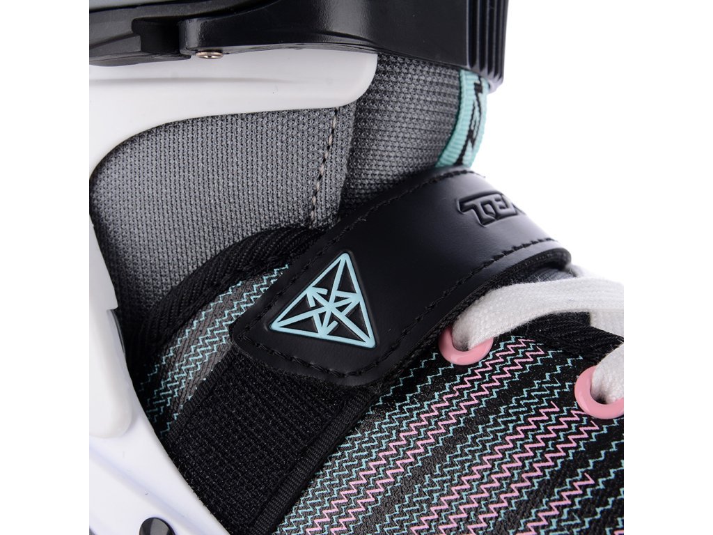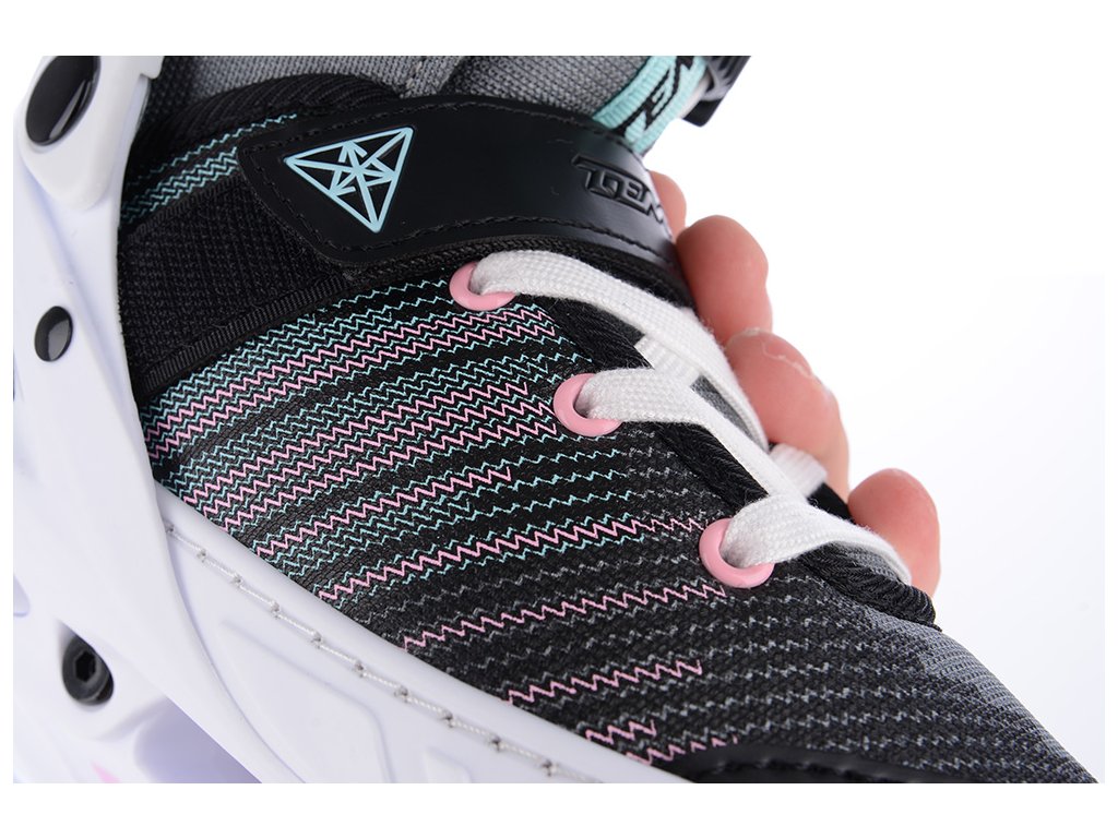Skelet brusle je pružný až do -20°C. Brusle jsou určeny pro rekreační sport, začínající a pokročilé malé bruslaře. Měkká rychleschnoucí výstelka zajišťuje pohodlí dětské nohy. Vnitřní botička je dobře anatomicky tvarována, vnější plastový skelet drží pevně kotník. Tyto dětské brusle jsou velmi vhodné pro začínající bruslaře díky funkční konstrukci a anatomicky řešenému tvaru skeletu i vnitřní botičky. Brusle mají jednoduchý a pohodlný systém zvětšení velikosti tlačítkem na boční straně skeletu. Brusli lze nastavit na 4 velikosti.