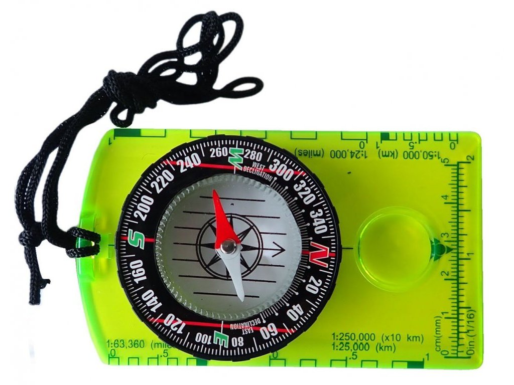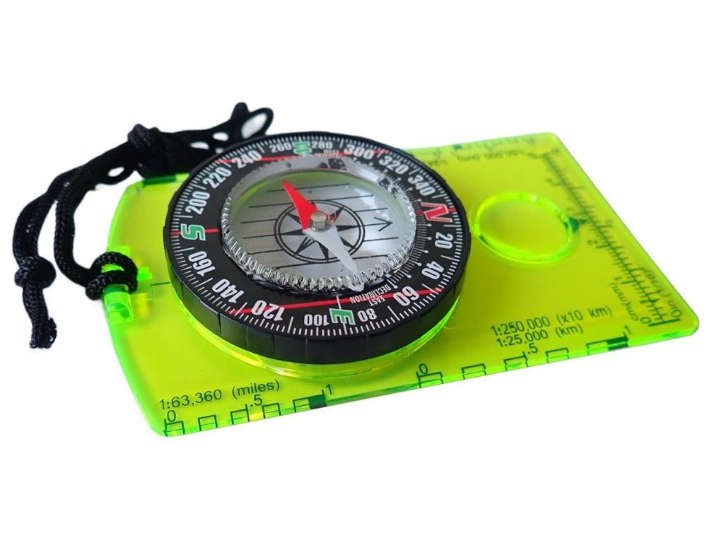 Buzola malá 114 x 62 mm. Buzola má směrovou šipku pro určení azimutu (úhlu pochodu), několik měřítek pro rychlé určení vzdálenosti na mapě a lupu pro čtení drobného textu. Buzola slouží pro orientační běh nebo pro turistiku a orientaci na mapě a v terénu. Součástí buzoly je šňůrka pro zavěšení buzoly na krk.