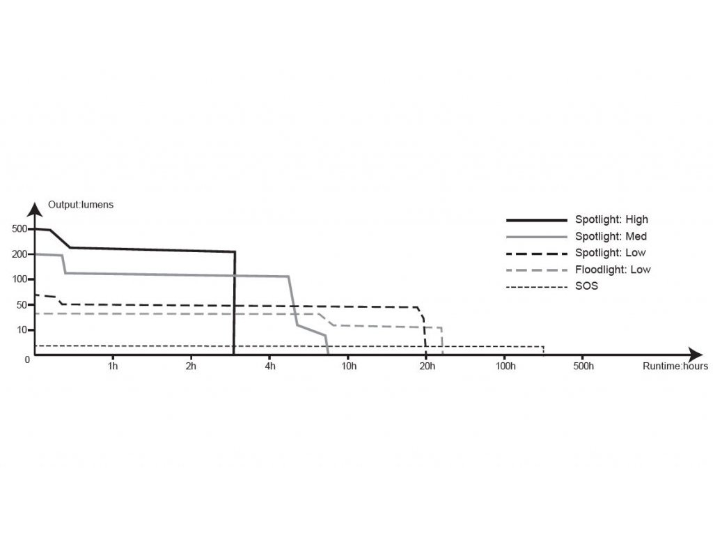 - Li-pol akumulátor 1300 mAh: 30 lumenů (30 hodin) -> SOS blikání 4 lumeny (300 hodin).