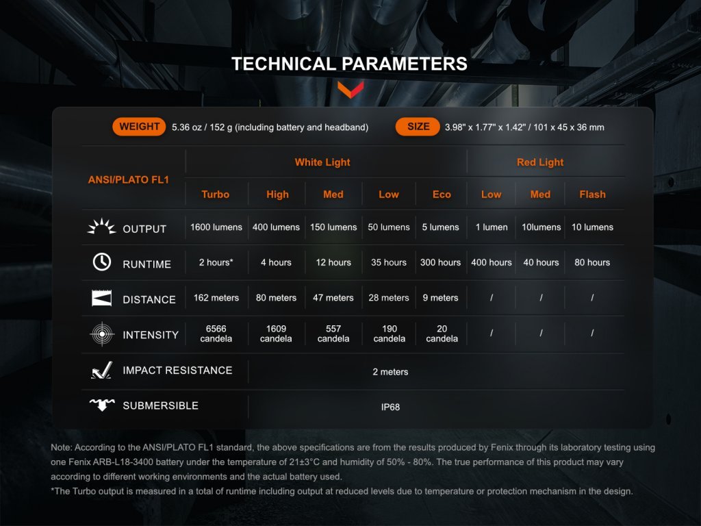 Všechny parametry svítilny (světelný tok, doba provozu na baterie, vodotěsnost, dosvit a nárazuvzdornost) jsou změřeny v souladu s normou ANSI/NEMA FL 1-2009.
