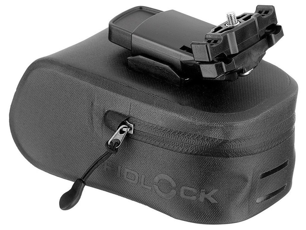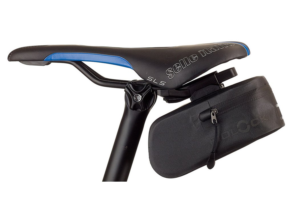 Univerzální podsedlová brašna se systémem magnetického uchycení umožňuje pomocí jednoho dotyku brašnu odepnout z držáku umístěného pod sedlem.
