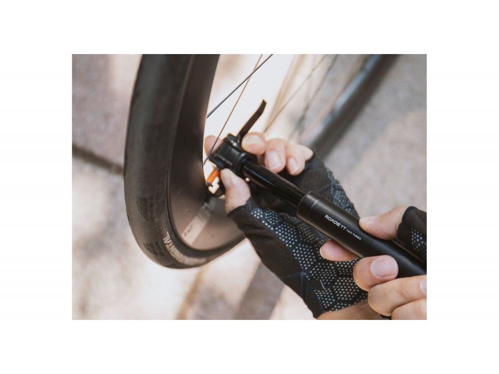 Roadie TT je celokovová kapesní mini pumpa s technologií Twin Turbo. Díky tomu se přenáší větší objem vzduchu z vnější komory s větším průměrem do vnitřní komory s menším průměrem, což zvyšuje efektivitu huštění při vyšších tlacích až o 50% . Integrovaná protiprachová hlavice udržuje hlavici pumpy čistou, zatímco upínací páčka zajišťuje dokonalé utěsnění.