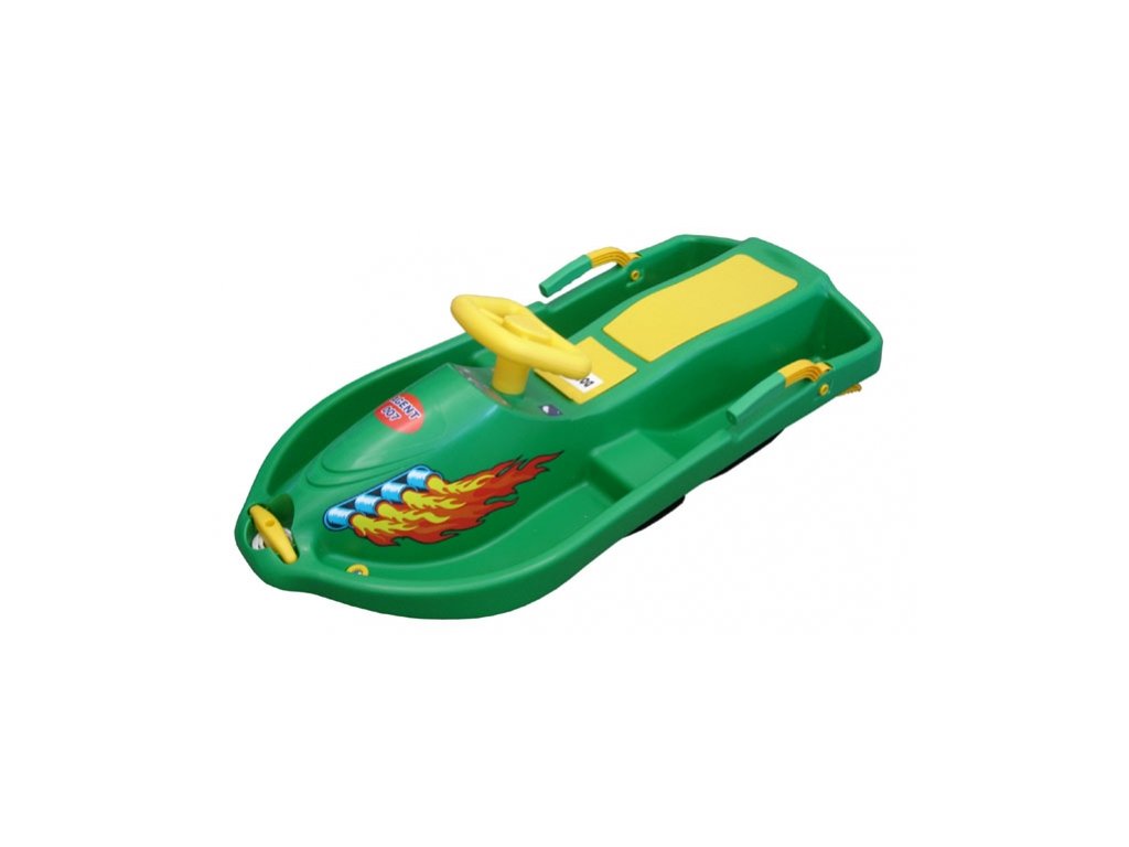Bob plastový řiditelný s volantem a brzdami - SNOW BOAT - určeno pro rekreační sport. Dodáváme v barvě zelené, se žlutými doplňky. Bob je opatřený kovovými táhly na řízení čtyř plastových lyží, což zajišťuje bezpečné ovládání bobu při jízdě. Bob má také dvě masivní pákové brzdy, které umožňují bezpečné zastavení bobu. Rozměry bobu jsou 93 x 44 x 35 cm, hmotnost 3,5 kg. Nosnost 40 kg.