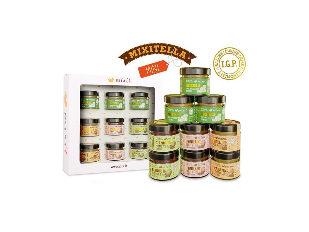 3x MiniMixitella Premium - Lískový oříšek z Piemontu (27 g), 2x MiniMixitella Premium - Piemontský lískový oříšek s fondánem (27 g), 2x MiniMixitella Premium - Piemontský lískový oříšek s karamelem (27 g), 2x MiniMixitella Premium - Lískový oříšek z Piemontu s mlékem a kakaem (27 g)