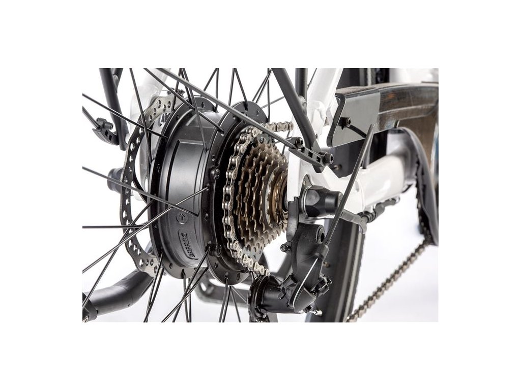 Zadní elektromotor Bafang vyniká velmi plynulým a tichým chodem. Nabízí nominální výkon 250 W, max. výkon 350 W a plně dostačující kroutící moment pro jízdu ve městě 45 Nm.