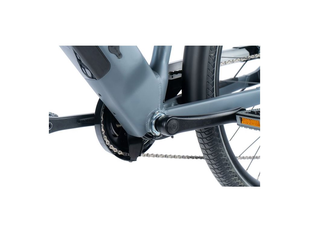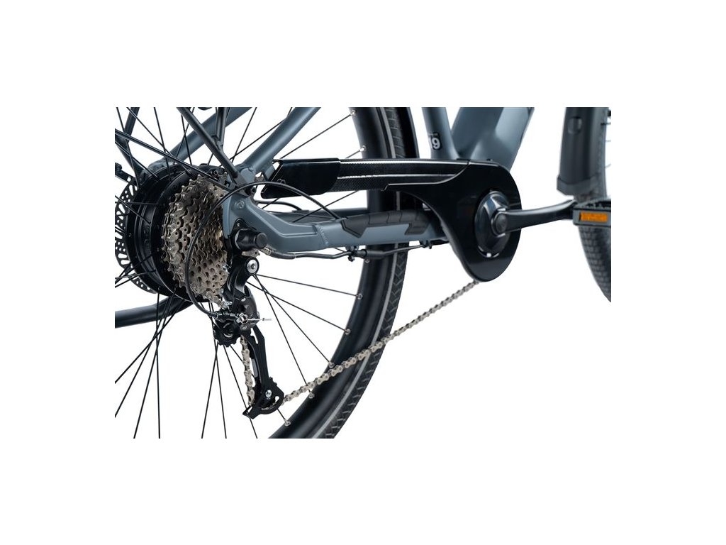 Zadní elektromotor Bafang vyniká velmi plynulým a tichým chodem. Nabízí nominální výkon 250 W, max. výkon 350 W a plně dostačující kroutící moment pro jízdu ve městě 45 Nm.