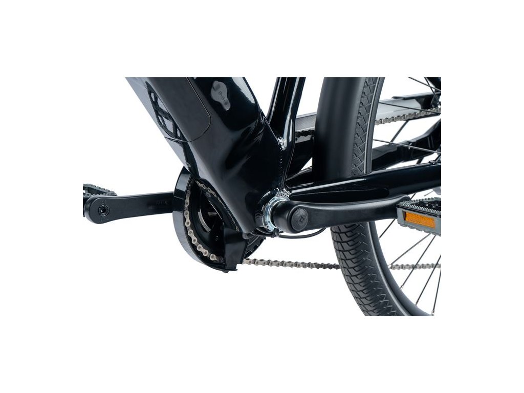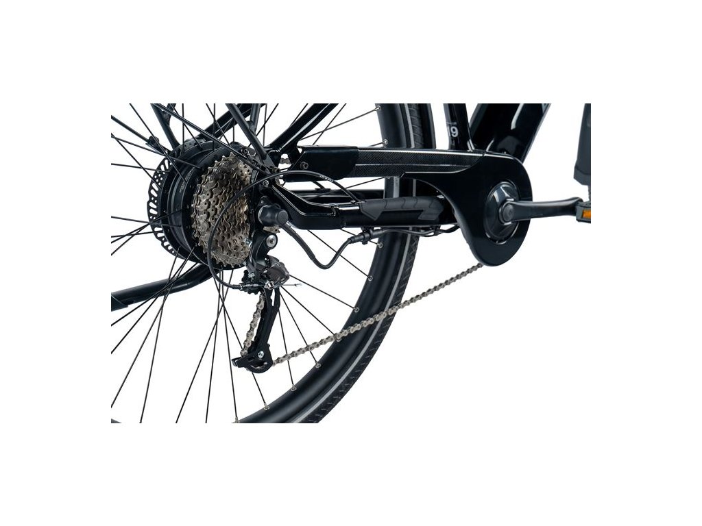 Zadní elektromotor Bafang vyniká velmi plynulým a tichým chodem. Nabízí nominální výkon 250 W, max. výkon 350 W a plně dostačující kroutící moment pro jízdu ve městě 45 Nm.