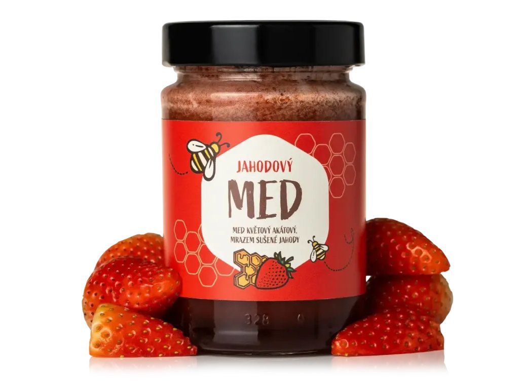 Milujete med? A milujete jahody? Tak tohle bude tutově vaše nová závislost. Jemný akátový med s jasmínovou vůní, který je jeden z vůbec nejsladších, jsme vylepšili hrstkou najemno drcených mrazem sušených jahod. Med má díky tomu nejen parádní červenou barvu, ale hlavně šťavnatou ovocnou chuť, kterou nejvíc oceníte jen tak na lžičce, na chlebíku, ve snídaňové kaši, jogurtu nebo třeba čaji. Bez přidaných stabilizátorů, cukerných sirupů a jiných přísad. Jen kvalitní med a jahody.