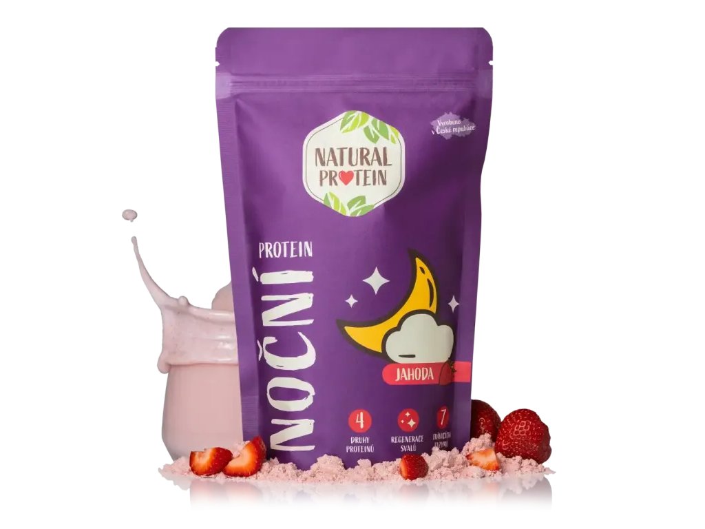 Jak během spánku neztrácet svalovou hmotu? Nakrmte tělo bohatou porcí čtyř kvalitních bílkovin. Micelární kasein se uvolňuje postupně 8 hodin, a tak svaly dostávají důležitou dávku aminokyselin celou noc. Protein zabrání nočnímu odbourávání svalů (katabolismu) a postará se o jejich správnou regeneraci a růst. 7 trávicích enzymů pak pomůže bílkoviny v těle lépe strávit a využít. Fajnšmekři ocení božskou chuť mrazem sušených jahod a čistou přírodní recepturu bez umělotin. Stačí rozmíchat ve vodě nebo mléce. Ideálka při dietě a pro sportovce či seniory, kteří nechtějí ztrácet svaly.