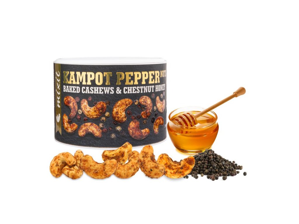 Mixit a Pepperfield společně upekli jedinečnou dobrotu! V našich pecích jsme spojili sladkost prémiového medu, růžovou hrubozrnnou sůl a ten nejkvalitnější kampotský pepř od Pepperfield, který se pyšní oceněním Great taste. Tuto luxusní lázeň jsme dopřáli našim výběrovým kešu oříškům a mandlím, které v žáru našich pecí získaly zlatavou barvu a dokonalou křupavost. Výsledek je prostě k sežrání! Vše jsme zabalili do krásného tubusu, který se hodí také jako dárek.