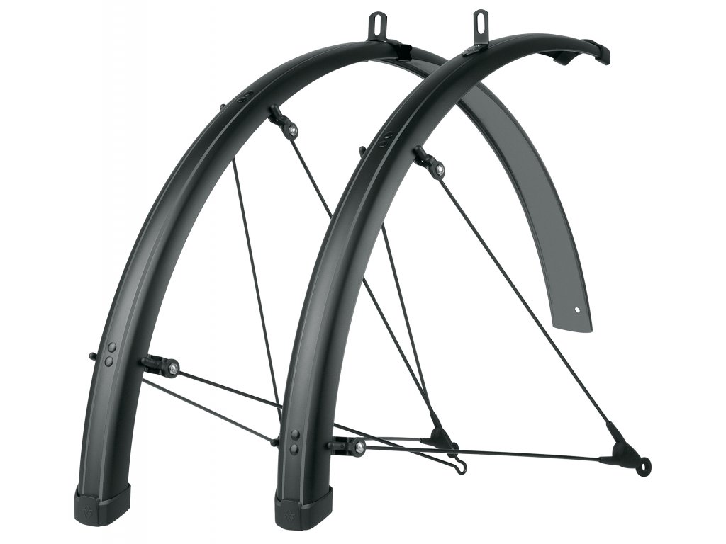Nyní ještě širší, delší a stylovější! Černě matná sada blatníků BLUEMELS STRIPES od SKS s šedými pruhy dodá kolu skvělý vzhled. Díky černým patkám a chrániči okrajů s logem SKS je čistý vzhled prostě dokonalý. Rozšířené profily zajišťují optimální ochranu proti stříkající vodě a nečistotám.