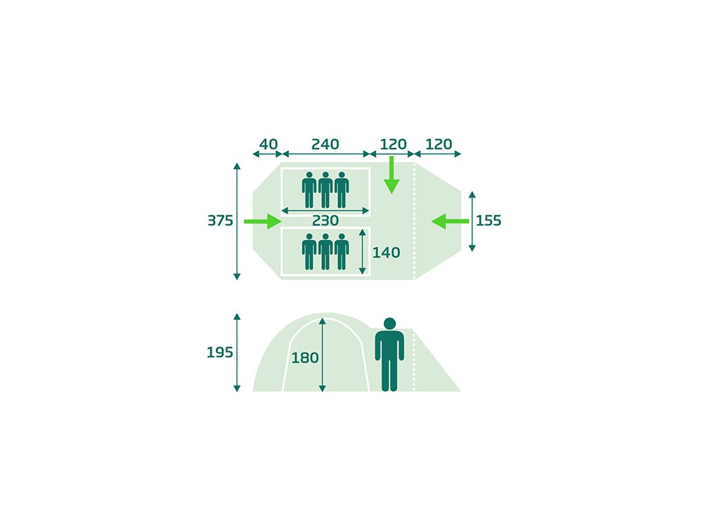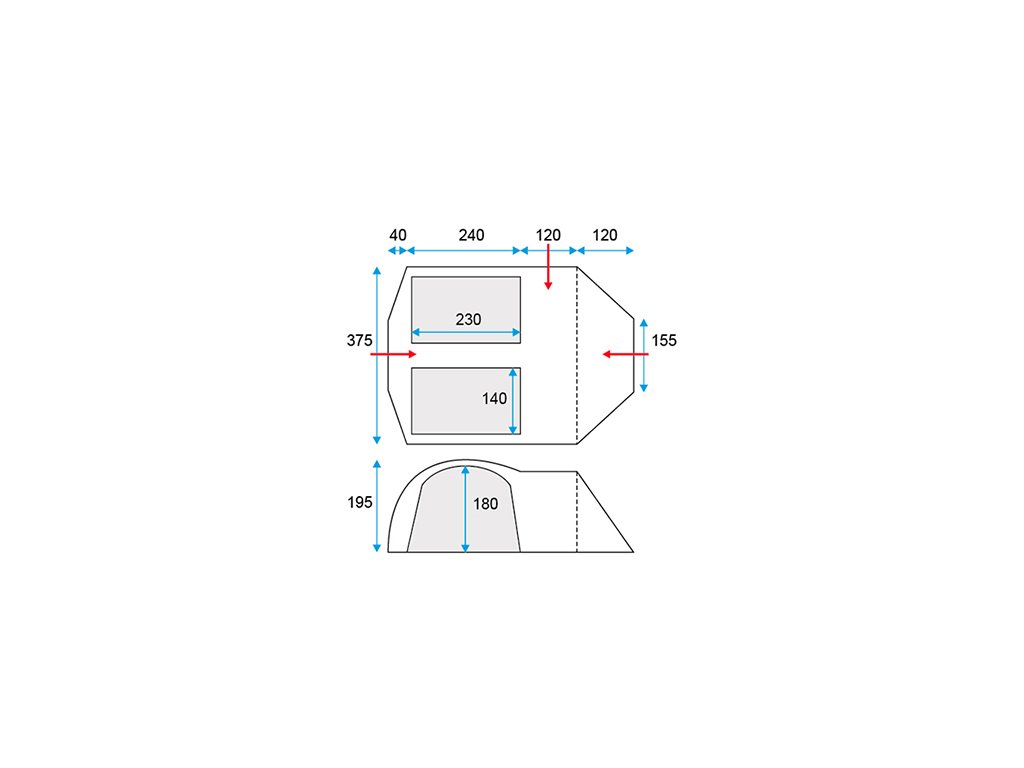 Rozměry (cm) - vnější stan: (40+240+120+120)*375*180