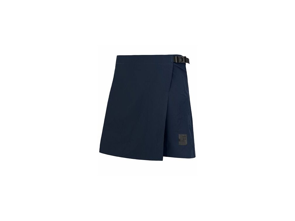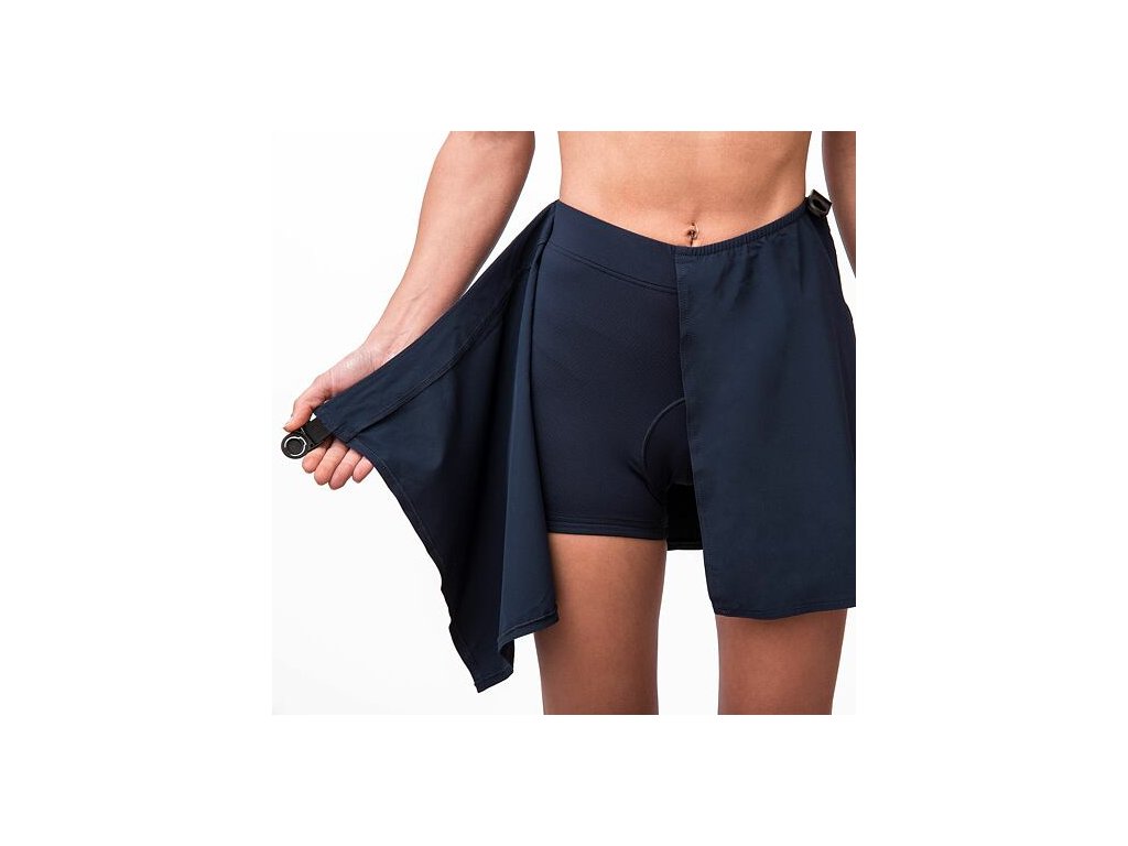 Cyklistická sukně s všitými elastickými cyklokalhotami. Sukně je vyrobena z pevné tkaniny odolné proti oděrkám a využívá rychlé zapínání v pase pomocí plastové spony. Vnitřní kalhoty jsou pevně spojeny se sukní a obsahují T.M.F. cyklovložku pro větší pohodlí. Superrychlý odvod vlhkosti od pokožky a ochrana UPF25 proti UV záření. Ionty stříbra zamezují zápachu a tvoří trvalou antibakteriální ochranu. Sukně je zdobena odolným, decentním potiskem.