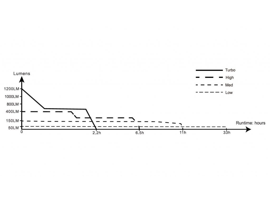 - Celkem pět režimů výkonu: 1200 lumenů (2,2 hodiny*) -> 400 lumenů (6,5 hodiny) -> 150 lumenů (11 hodin) -> 50 lumenů (33 hodin) -> blikání (pulzování mezi 50 a 400 lumeny).