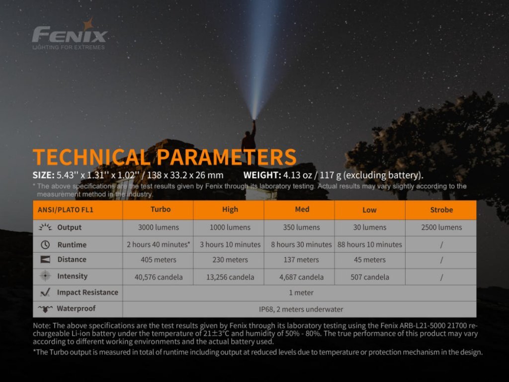 Všechny parametry svítilny (světelný tok, doba provozu na baterie, vodotěsnost, dosvit a nárazuvzdornost) jsou změřeny v souladu s normou ANSI/NEMA FL 1-2009.