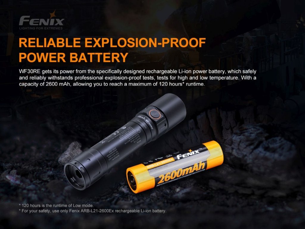 Profesionální nabíjecí svítilna Fenix WF30RE je opatřena certifikací ATEX/IECex pro použití ve výbušném prostředí. Svítilna je napájená speciálně upraveným Li-ion akumulátorem ARB-L21-2600Ex s kapacitou 2600 mAh a poskytuje světelný tok až 280 lumenů s dosvitem 170 metrů. Akumulátor se dobíjí přímo ve svítilně za pomoci speciální nabíječky s bezpečnostními obvody. Tělo svítilny je vyrobeno z leteckého hliníku s vysokou odolností a nárazuvzdorností. Svítilna je určena zvláště pro hasiče a záchranáře, dále je vhodná jako pracovní svítilna do průmyslových provozů s možností výskytu výbušných prachů a plynů. Jedná se například o chemičky, rafinerie, textilky, papírny, mlýny, metalurgické provozy, elektrárny a další provozy.