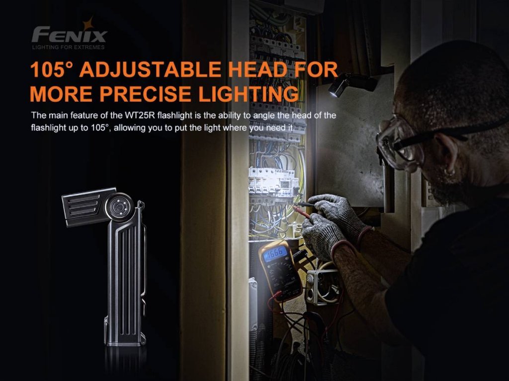 Fenix WT25R je univerzální nabíjecí pracovní svítilna s unikátní kloubovou konstrukcí s naklápěcím reflektorem, který používá LED Cree XP-L HI se světelným tokem až 1000 lumenů a dosvitem až 220 metrů (ANSI). Naklápěcí hlava v rozsahu 105 stupňů zaručuje maximální univerzálnost. Svítilna Fenix WT25R je rovněž vybavena pevnou ocelovou sponou pro snadné nošení na opasku či pracovním oděvu a magnetickou koncovkou, kterou lze snadno uchytit na cokoliv železného. Svou variabilitou je svítilna velmi užitečná zvláště pro pracovní použití, kempování, pohyb v přírodě a mnoho dalších činností.
