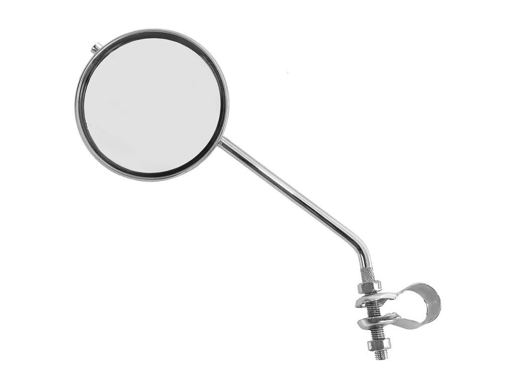 Zrcátko pro kola, skůtry, mopedy Pochromované Průměr: 80 mm Délka úchytu: 220 mm Upnutí: svorka Balení: servisní v sáčku Určeno pro odborný servis
